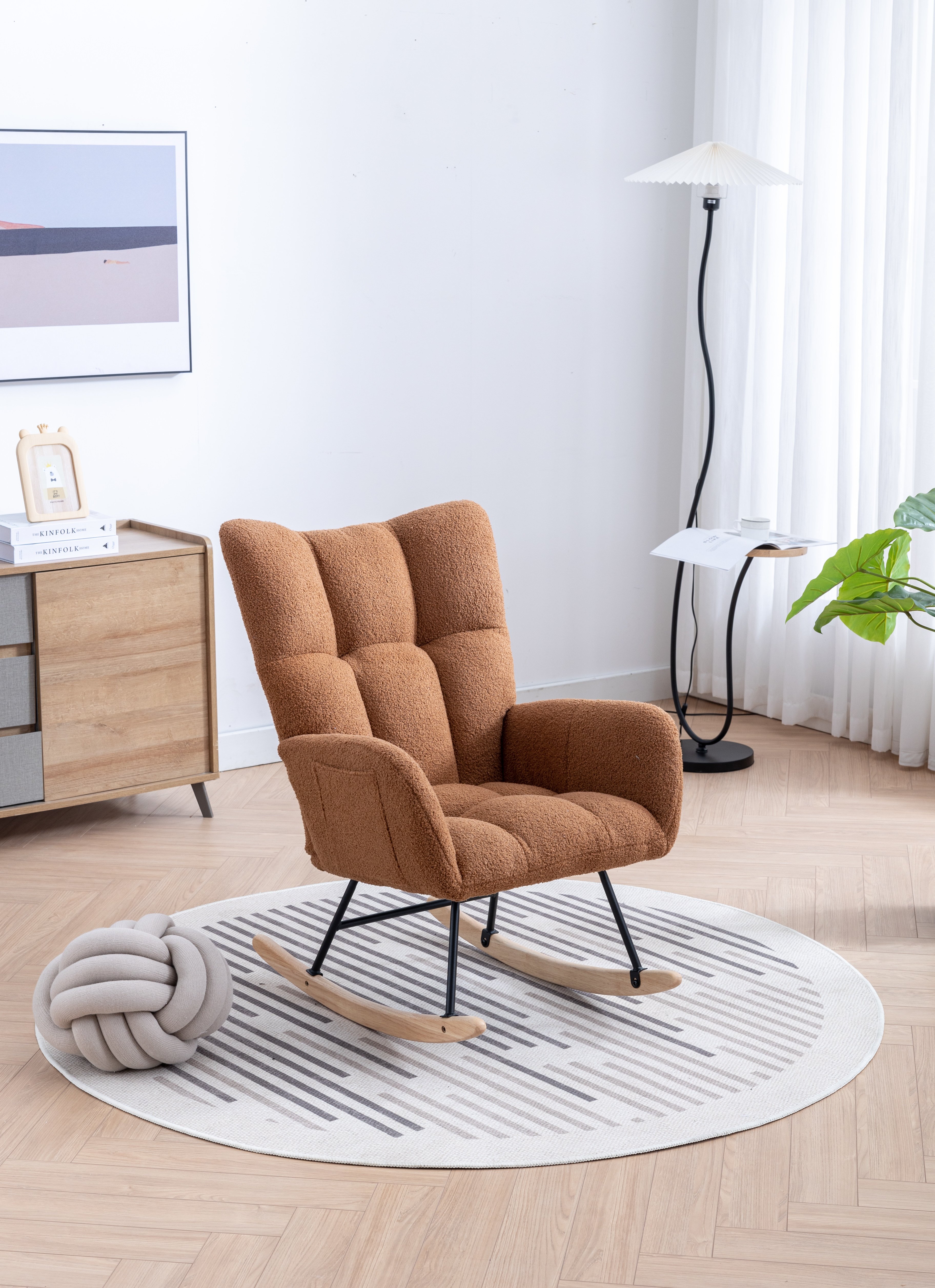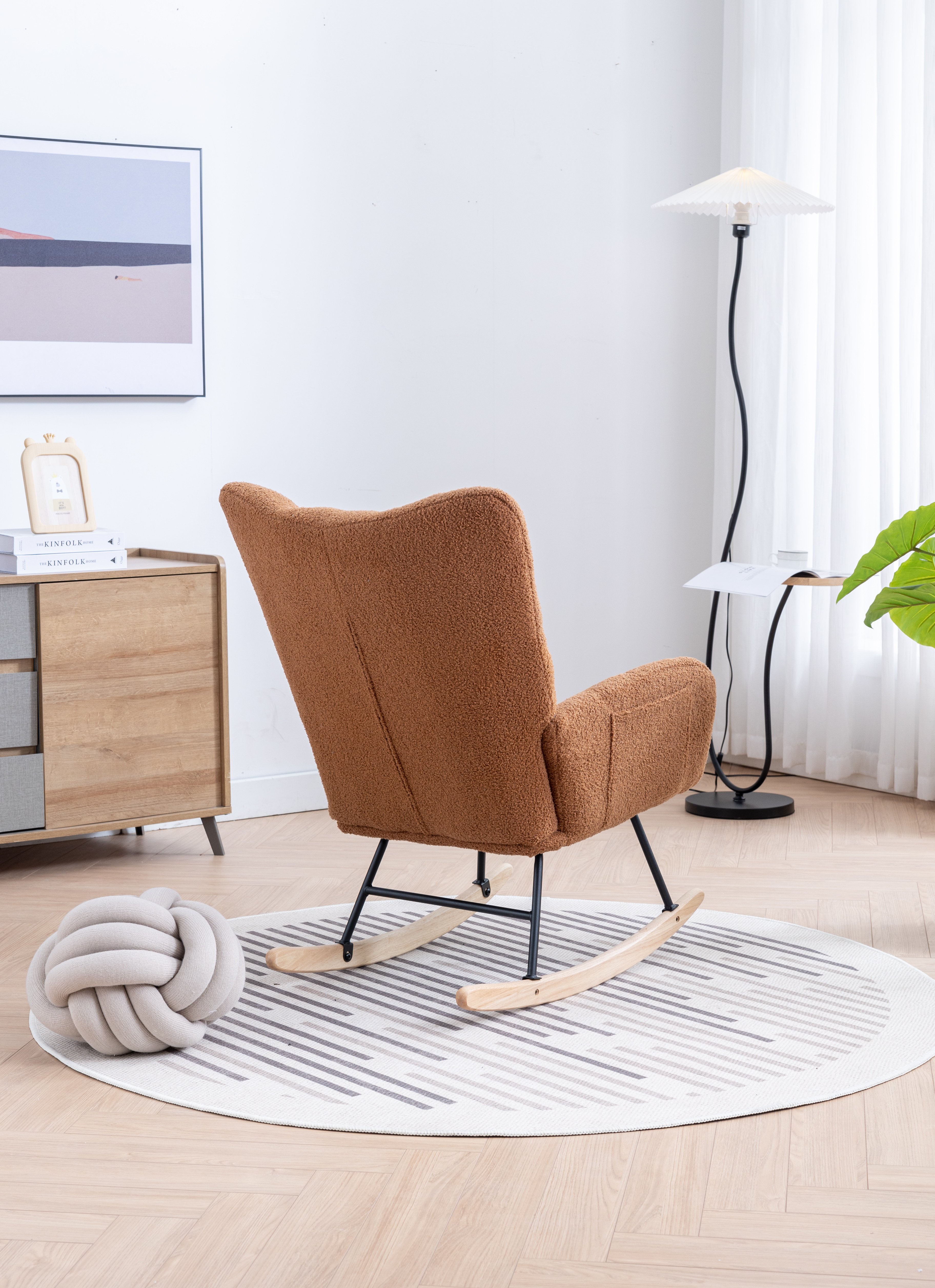 [Super Comfortable]: This modern rocking chair is covered with breathable and soft teddy velvet fabric and filled with a high-density soft sponge to create the ultimate seating comfort. The seat with roomy depth and width is firm and well-cushioned, which allows the barrel chair to provide you with ample seating space while optimizing comfort.