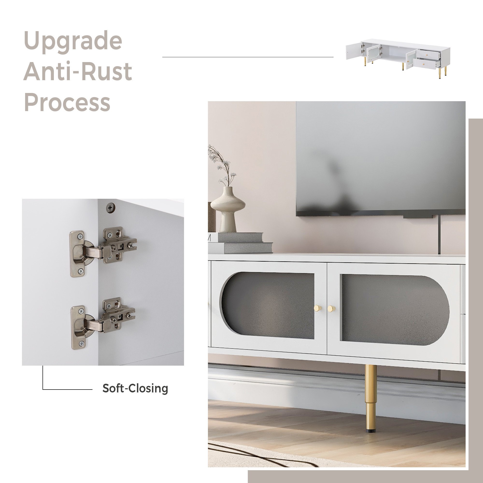 About This ItemFunctional Keywords1.Multi-Functional storage 2.Upgrade Anti-Rust Process3. Soft-Closing 4.Cable Management 5.Magnetic SuctionAppearance Keywords1.Highe Quality Paint2.Exquisite Cabinet Legs3.Frosted Glass 4. Sleek Panel